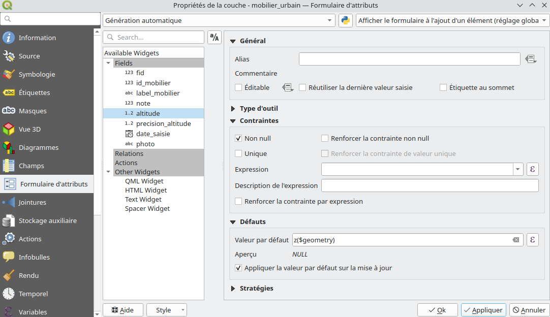 Nous allons régler le remplissage automatique du champ d’altitude pour chaque point capturé avec la valeur d’altitude fournie par la mesure GPS. Dans le menu de formulaire d’attributs, sélectionnez le champ altitude. Dans la partie Général, décochez la case Éditable. Dans la partie Contraintes, cochez la case Non null. Puis dans la partie Défauts, à la ligne Valeur par défaut, entrez l’expression suivante :