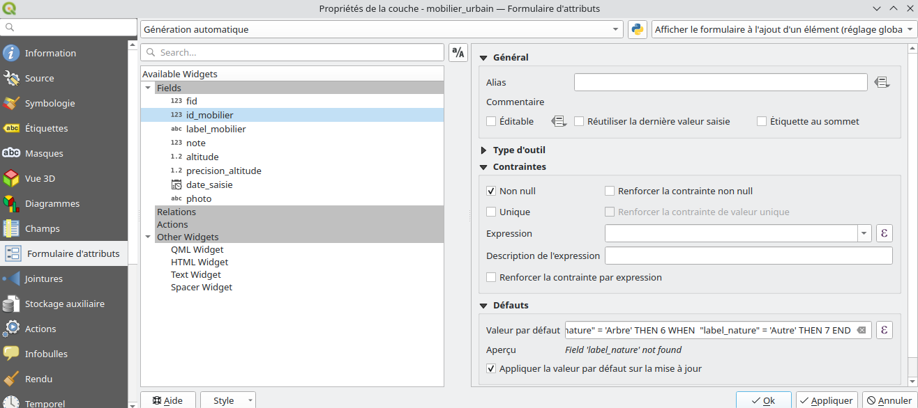 Nous allons maintenant faire en sorte que l’identifiant du type de mobilier (stocké dans le champ id_mobilier) soit mis à jour automatiquement selon le type de mobilier renseigné. Cette automatisation nous évitera d’associer par mégarde un mauvais identifiant à un mobilier donné. Dans le menu de formulaire d’attributs, sélectionnez le champ id_mobilier. Dans la partie Général, décochez la case Éditable, ça empêchera l’utilisateur de toucher manuellement à ce champ. Dans la partie Contraintes, cochez la case Non Null et la case Renforcer la contrainte non null. Puis dans la partie Défauts, à la ligne Valeur par défaut, entrez l’expression suivante :