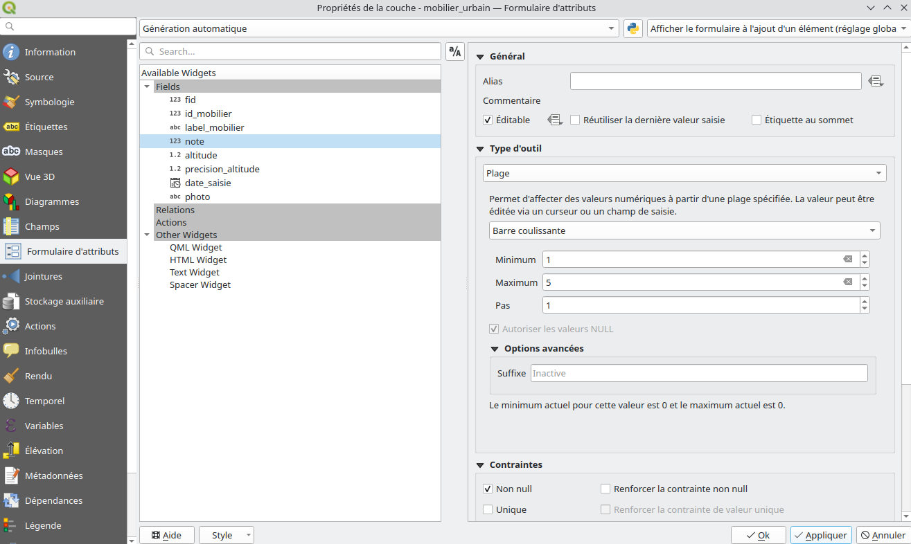 Pour le champ note, nous allons faire en sorte d’afficher un curseur défilant de 1 à 5 au moment de la capture. Dans le menu de formulaire d’attributs, sélectionnez le champ note. Dans la partie Type d’outil, choisissez Plage puis le menu déroulant Barre coulissante. Définissez un Minimum de 1 et un Maximum de 5 avec un Pas de 1. Puis dans la partie Contraintes cochez la case Non null (Figure 8).