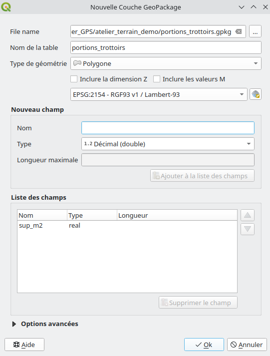 À la ligne File name, allez dans votre répertoire de travail et sauvegardez cette couche sous le nom portions_trottoir.gpkg. Le Type de géométrie est Polygone et le système de coordonnées de référence doit être Lambert 93 (EPSG 2154). Nous ajoutons un champ qui contiendra la superficie calculée automatiquement lors de la digitalisation. Nommez ce champ sup_km2 en Type Décimal. Dans le Panneau des couches, placez cette couche sous votre couche mobilier_urbain. Réglez sa symbologie en transparent et sauvegardez son style par défaut au sein de la couche.