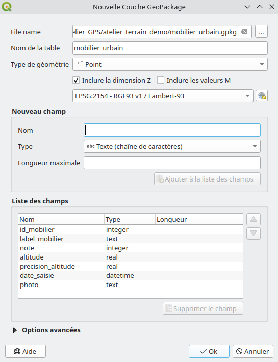À la ligne File name, pointez vers votre répertoire de travail et nommez votre couche mobilier_urbain. Pour le Type de géométrie, choisissez Point. Cochez la case Inclure la dimension Z, cela nous permettra d’enregistrer l’altitude du point. Réglez le système de coordonnées de référence en Lambert 93 (EPSG 2154). Puis ajoutez les champs en suivant les spécifications du tableau Table 2. La couche (vide) apparaît dans le Panneau des couches.