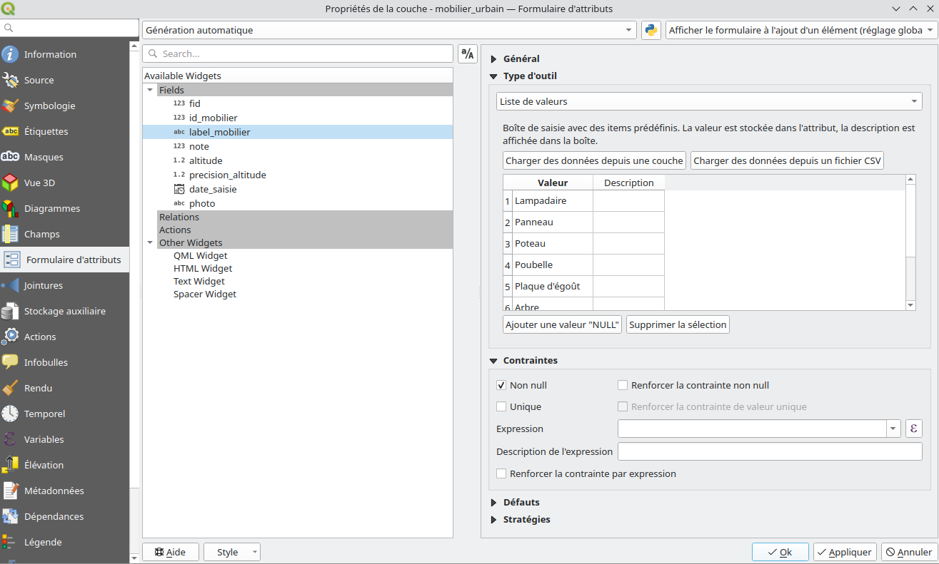 Dans la partie Type d’outils, choisissez Liste de valeurs et remplissez le tableau des valeurs possibles juste au-dessous. Dans Contraintes vous pouvez cocher Non null pour forcer l’utilisateur à renseigner une valeur. Puis cliquez sur Appliquer. Ce formulaire nous permettra de choisir une valeur de mobilier parmi une liste déroulante afin d’éviter les erreurs de saisie sur le terrain.