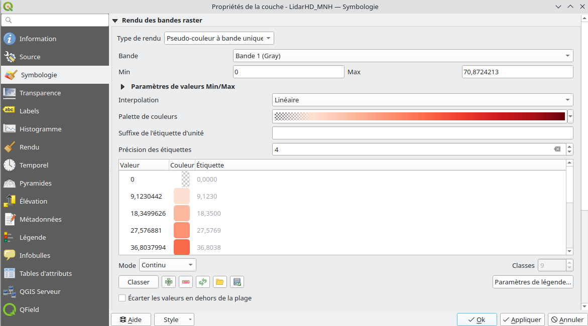 Copiez le raster de MNH issu du Lidar HD de l’IGN LidarHD_MNH.tif dans votre répertoire de travail et chargez le dans QGIS. Réglez sa symbologie en teintes de rouge en faisant un clic droit sur la couche → Propriétés → Symbologie. Dans le menu Type de rendu, choisissez Pseudo-couleur à bande unique puis cliquez sur Classer. Enlevez la toute première valeur négative (si il y en a une) et ajoutez une valeur de zéro avec un style transparent (Figure 1). Puis cliquez sur Appliquer.