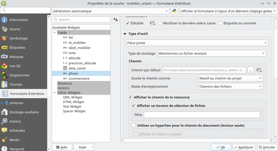 Le paramétrage de ce champ nous permettra d’accéder à l’appareil photo de notre téléphone lorsque nous le mettrons à jour depuis QField. Les photos seront enregistrées dans un répertoire nommé DCIM ou files à la racine de notre projet. Dans le menu de formulaire d’attributs, sélectionnez le champ photo. Dans la partie Type d’outils, choisissez Pièce jointe, réglez Type de stockage à Sélectionnez un fichier existant. Dans le cadre Chemin, à la ligne Stocke le chemin comme, choisissez Relatif au chemin du projet. À la ligne Mode d’enregistrement, choisissez Chemin des fichiers. Laissez les autres valeurs par défaut (Figure 10).