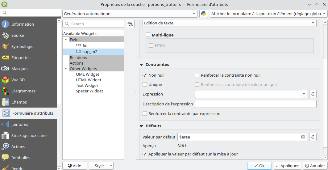 Sélectionnez le champ sup_m2, dans la partie Général décochez la case Éditable, ce qui rendra ce champ inaccessible à l’utilisateur. Dans la partie Contraintes, cochez la case Non null. Dans la partie Défauts, pour la Valeur par défaut entrez l’expression suivante :