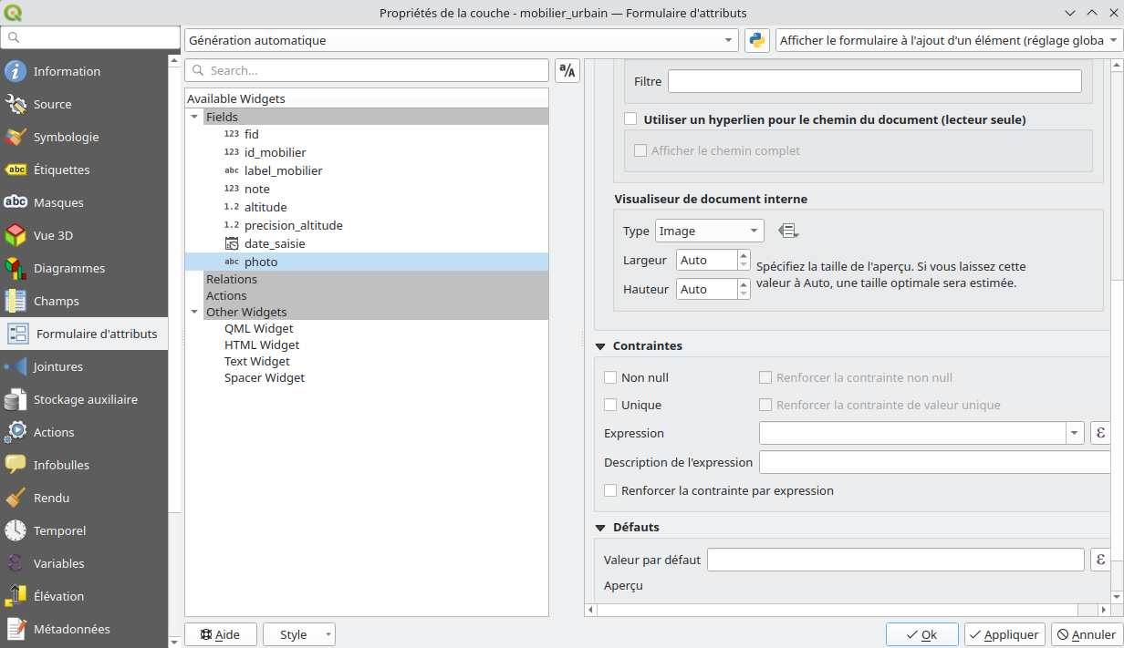 Afin d’afficher les photos prises dans la table attibutaire, faites un clic droit sur la couche mobilier_urbain → Propriétés → Formulaire d’attributs et sélectionnez le champ photo. Dans la partie Visualiseur de document interne, choisissez Image puis cliquez sur Appliquer (Figure 30).