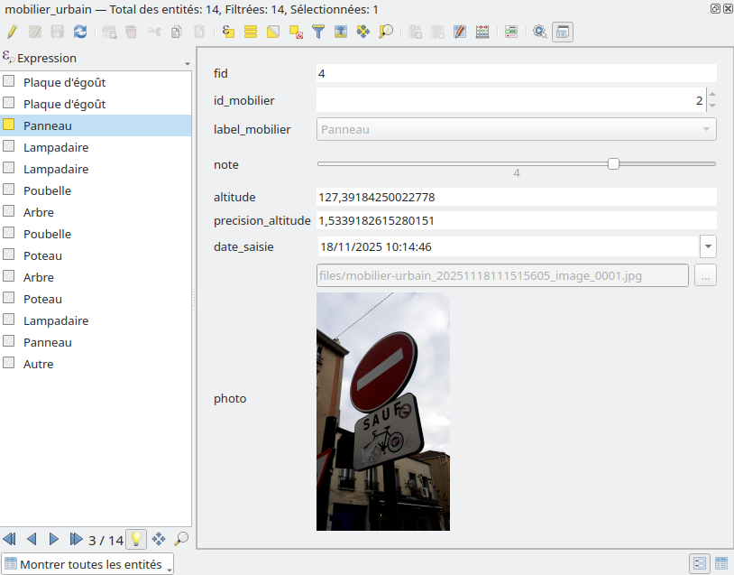 Ouvrez maintenant la table attributaire de la couche mobilier_urbain et choisissez Basculer sur la vue formulaire en bas à droite de la fenêtre de la table attributaire. Pour les entités pour lesquelles une photo a été prise, la photo s’affichera dans cette vue formulaire (Figure 31).
