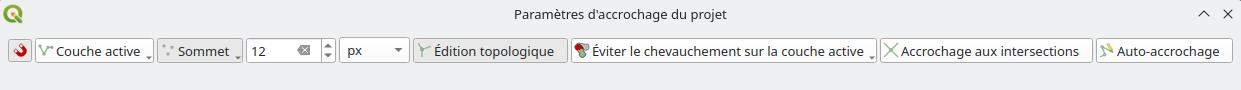 Les portions de trottoirs que nous digitaliserons ne peuvent pas se chevaucher, nous allons donc régler la topologie pour empêcher ces chevauchements. Commencez par sélectionner votre couche portions_trottoirs et allez dans le menu Projet → Options d’accrochage…. Le menu suivant s’ouvre (Figure 14).