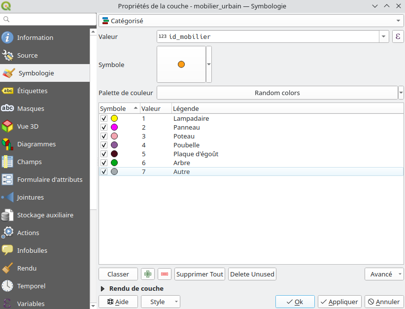 Dans le menu déroulant du haut, choisissez Catégorisé et dans le champ Valeur, choisissez l’attribut id_mobilier. Ajoutez ensuite sept symboles en cliquant sept fois sur le plus. Vous pouvez changer la couleur des symboles et renseignez les identifiants de 1 à 7 dans la colonne Valeur. Renseignez les labels de chaque type de mobilier dans la colonne Légende puis cliquez sur Appliquer. Sauvegardez ce style par défaut en cliquant sur Style → Enregistrer par défaut → Base de données source. Maintenant, dès que nous capturerons un arbre dans QField, le point suivra le symbole dévolu à l’arbre.