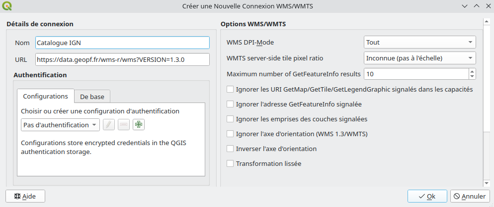 Nous allons maintenant ajouter un fond orthophoto fausses couleurs infrarouge de l’IGN. Il s’agira cette fois-ci d’un flux WMS. Dans le Panneau explorateur faites un clic droit sur le menu WMS/WMTS et choisissez Nouvelle connexion. La fenêtre suivante apparaît (Figure 3).