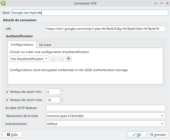 À la ligne Nom donnez un nom à la connexion, par exemple Google Satellite Hybride. À la ligne URL, entrez l’URL suivante :
