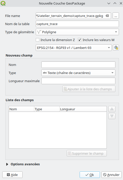 À la ligne File name, allez dans votre répertoire de travail et sauvegardez cette couche sous le nom capture_trace.gpkg. Le Type de géométrie est Polyligne. Cochez la case Inclure les valeurs M ce qui permettra d’associer à chaque point de la ligne les données fournies par le GPS au moment de la capture. Enfin, le système de coordonnées de référence doit être Lambert 93 (EPSG 2154). Cette couche enregistrera notre trace GPS sous forme de lignes.