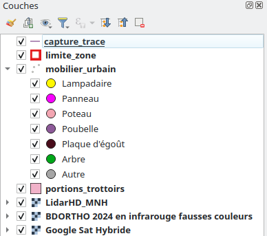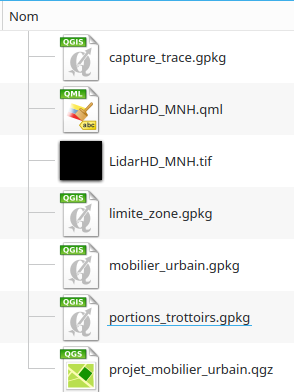 Votre répertoire de travail atelier_terrain doit contenir l’intégralité des couches de votre projet ainsi que votre projet projet_mobilier_urbain.qgz lui même (Figure 17).