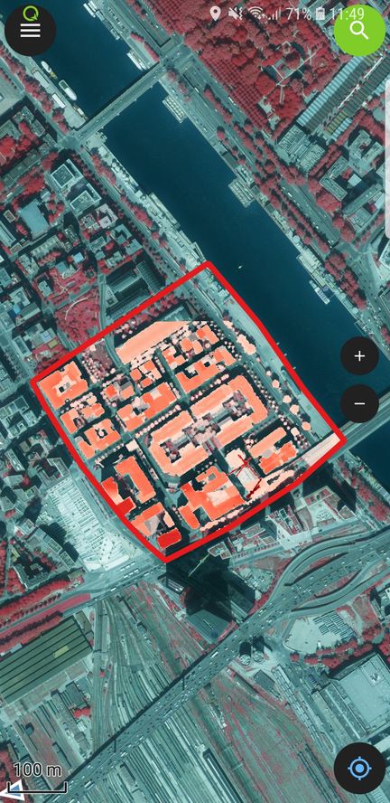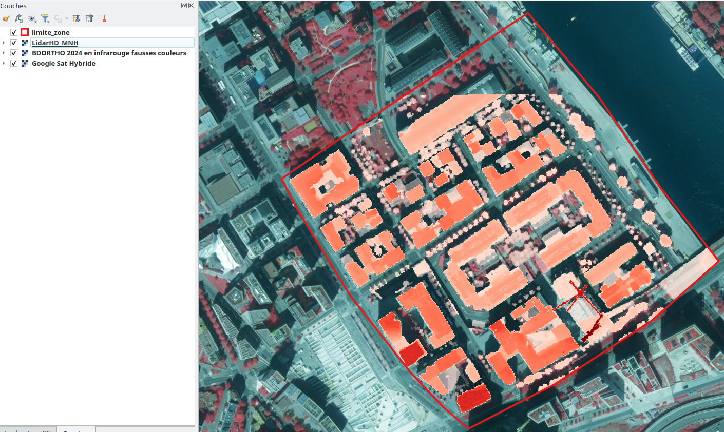 Afin de contextualiser notre projet, nous ajouterons un fond Google satellite hybride et une orthophoto infrarouge fausses couleurs. Nous chargerons également un raster de modèle numérique de hauteur (MNH) afin d’avoir une idée de la hauteur des bâtiments. Enfin, nous aurons une couche vecteur de type polygones pour délimiter notre zone d’étude.