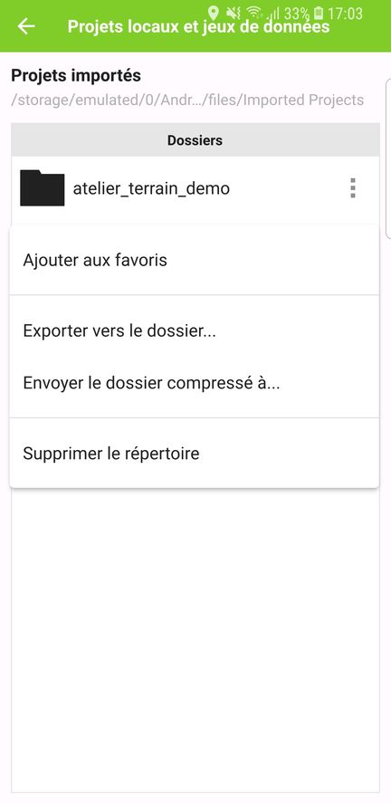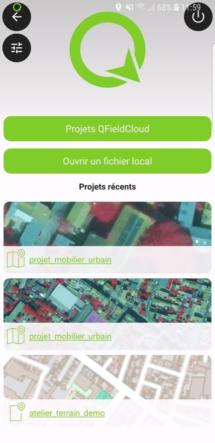 Une fois ces vérifications effectuées, compressez votre répertoire de travail dans un zip pour obtenir un fichier nommé atelier_terrain.zip. Transférez ce fichier sur votre téléphone via un câble, par mail, via un stockage en ligne … Une fois ce zip transféré sur votre téléphone, ouvrez un navigateur de fichiers sur votre téléphone jusqu’à votre zip et choisissez Ouvrir avec → QField. Votre projet s’ouvre dans QField avec la vue que vous avez paramétrée (Figure 18).