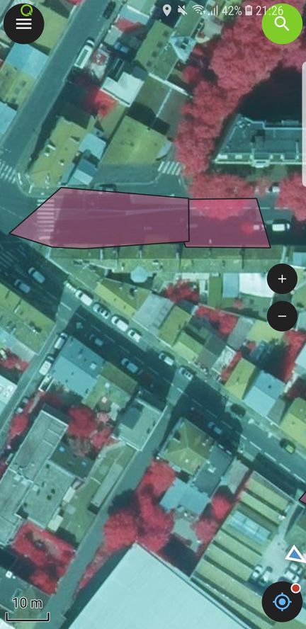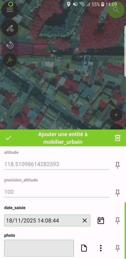 Sur le même principe que pour la couche du mobilier urbain, nous allons mettre à jour la couche portions_trottoirs en y ajoutant des polygones. Le principe est le même que précédemment, dans le menu général, nous sélectionnons la couche portion_trottoirs et nous la basculons en mode numérisation en cliquant sur l’icône du crayon en bas à droite de l’écran. Si nécessaire, il est possible de décrocher le curseur de digitalisation de la position courante en cliquant sur la cible bleue carrée en bas à droite. En bougeant le curseur et en ajoutant un nœud avec l’icône plus, nous digitalisons la portion de trottoir choisie. Pour refermer le polygone, il suffit de cliquer sur l’icône verte. La table attributaire apparaît et le champ de superficie se met à jour automatiquement car nous l’avons paramétré ainsi.