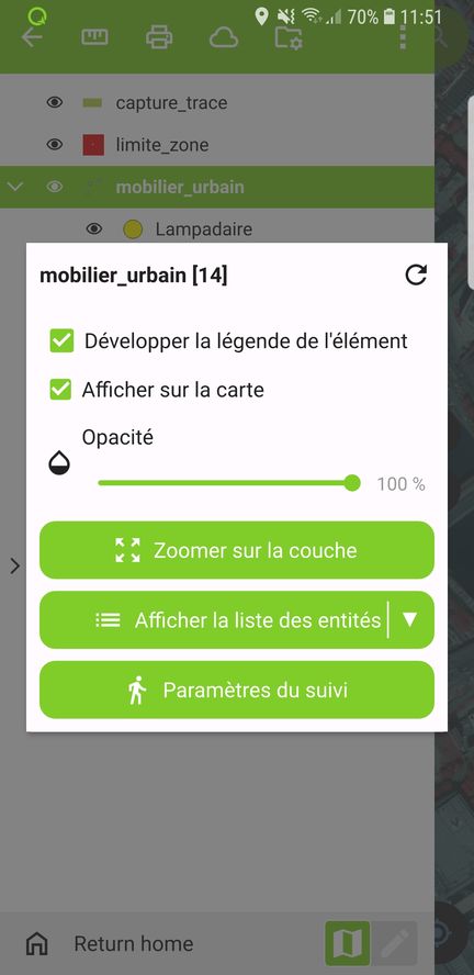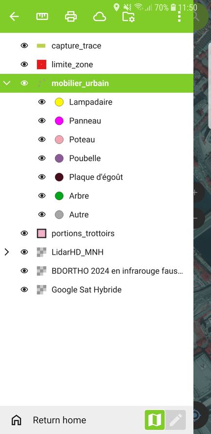Nous allons commencer par capturer la position de différents mobiliers urbains. Tout d’abord, dans le menu des couches (Figure 19) nous sélectionnons notre couche mobilier_urbain et nous la passons en mode numérisation en cliquant sur l’icône du crayon en bas à droite de l’écran. Afin que les champs d’altitude et de précision de l’altitude soient automatiquement renseignés, il est nécessaire de bloquer le curseur de données sur la position. Cela se fait simplement en cliquant sur la cible carrée bleue en bas de l’écran. La flèche bleue de positionnement est alors synchronisée avec la cible de digitalisation. Approchez vous d’un mobilier à capturer et cliquez sur l’icône plus verte pour capturer la position.