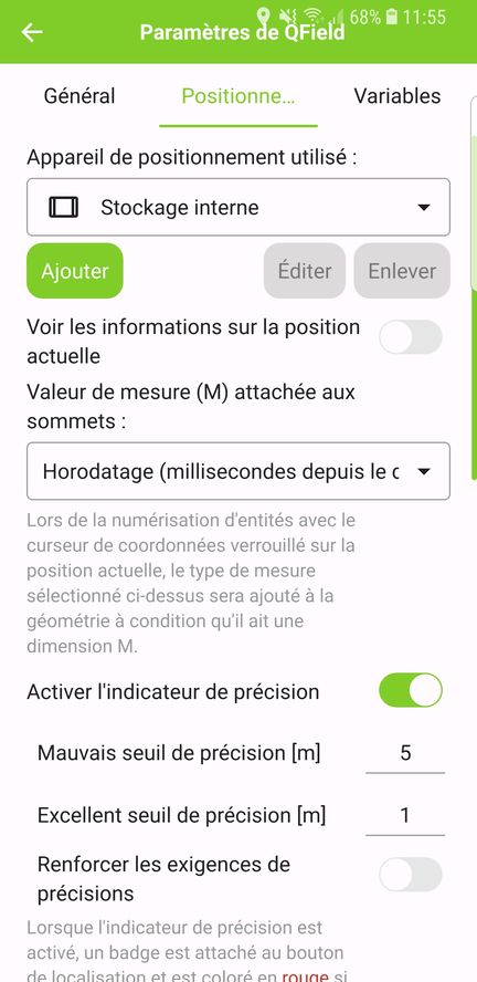 Il est possible de faire quelques réglages préliminaires. Par exemple, dans le menu général, cliquez sur l’icône des trois points superposés en haut à droite et choisissez Paramètres et allez dans l’onglet Positionnement. Nous allons Activer l’indicateur de précision (Figure 21). Cette option nous permettra d’avoir une idée de la précision du positionnement au moment de la capture des points.