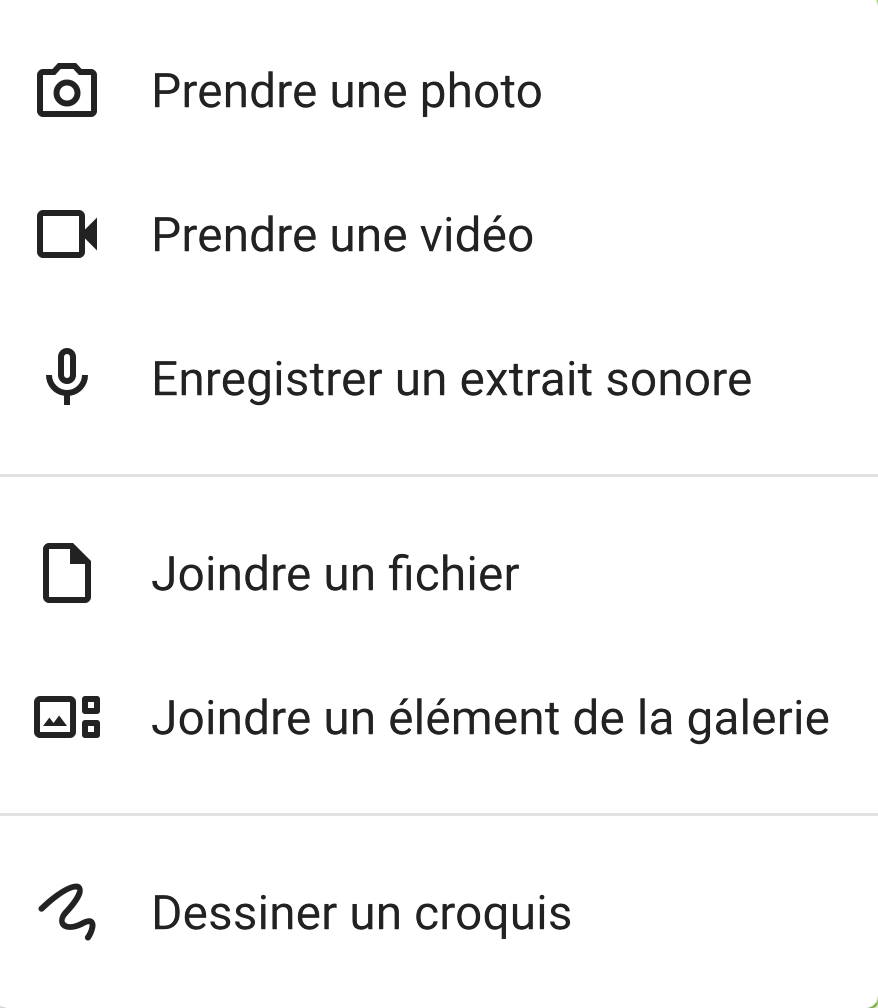 Il est possible de remplir manuellement le champ commentaire si nécessaire. Enfin, pour attacher une photo au point capturé, il suffit de cliquer sur l’icône des trois points verticaux à côté du champ photo. Un menu apparaît, depuis lequel il est possible de Prendre une photo via l’appareil du téléphone (Figure 26).