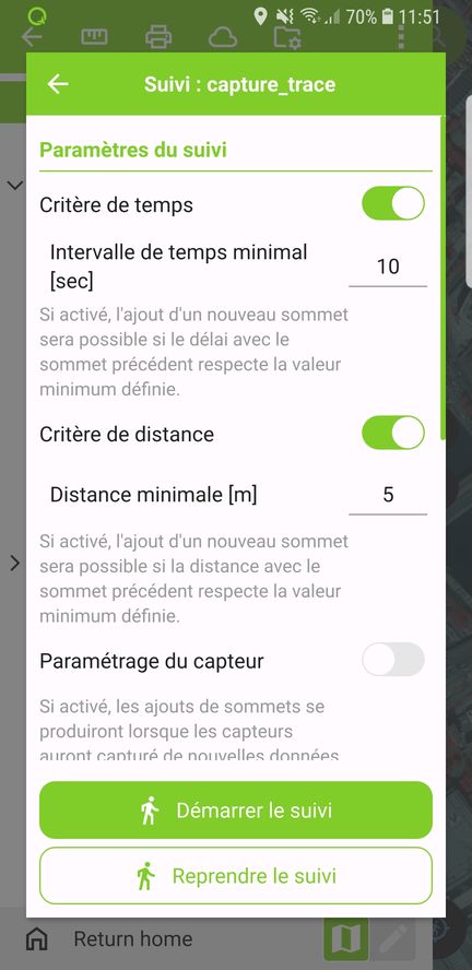 Dans certains cas, il peut être intéressant de capturer sa trace GPS afin de visualiser à posteriori le chemin parcouru. Dans cet exemple, nous allons l’enregistrer sur la couche dédiée nommée capture_trace. Dans le menu général, restez appuyés sur la couche capture_trace et choisissez Paramètres du suivi. Notez bien qu’une trace GPS n’est pas une ligne à proprement parler mais une série de positions capturées par le GPS à un pas de temps régulier, reliées ensuite les unes les autres par des portions de ligne. Le premier paramètre à régler est l’intervalle de temps entre deux enregistrements, par exemple 10 secondes. Un point sera ainsi enregistré toutes les 10 secondes. Nous pouvons également ajouter un Critère de distance minimale pour déclencher l’enregistrement, par exemple 5 mètres. Cela signifie, que le point ne sera pas enregistré si le point précédent est à moins de 5 mètres. Il est donc possible de s’arrêter sur son parcours sans créer un amoncellement de points au même endroit (Figure 22).